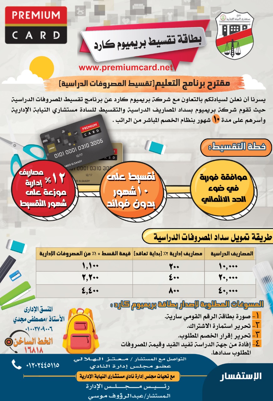 يسعدنا بفضل الله تعالى أن نعلن لسيادتكم عن الإتفاق مع شركة بريميوم كارد لخدمات تقسيط أى مصروفات دراسية على ۱۰ شهور بدون فوائد والخصم من الراتب و ١٢% مصاريف إدارية موزعة على شهور التقسيط