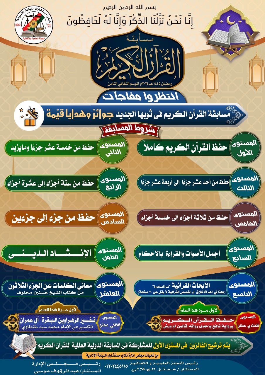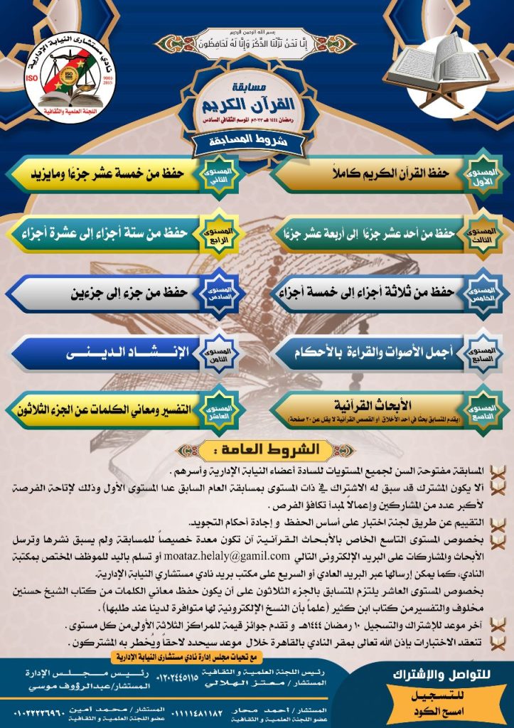 وإذ يسعد مجلس إدارة النادى أن يعلن لسيادتكم بفضل الله وتوفيقه عن مسابقة القرآن الكريم للعام الهجرى ١٤٤٤ وذلك بفضل الله و منته فى موسمها السابع على التوالى ” للسادة مستشارى النيابة الإدارية و أسرهم ” ……
