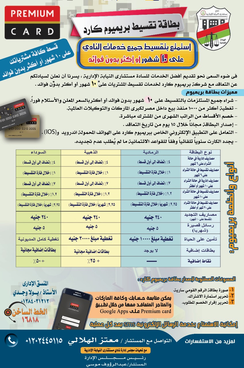 يسعدنا بفضل الله تعالى أن نعلن لسيادتكم عن تجديد التعاقد مع شركة بريميوم كارد لخدمات تقسيط كافة أنواع المشتريات على ۱۰ شهور أو أكثر بدون فوائد ( فقط مصروفات إدارية ) …..